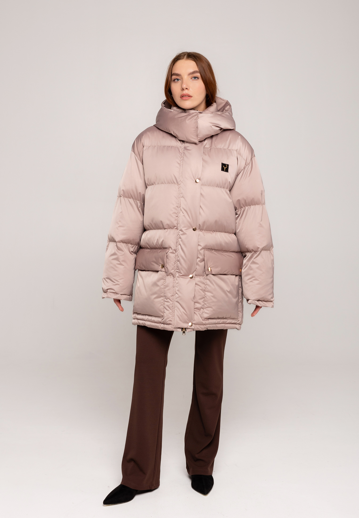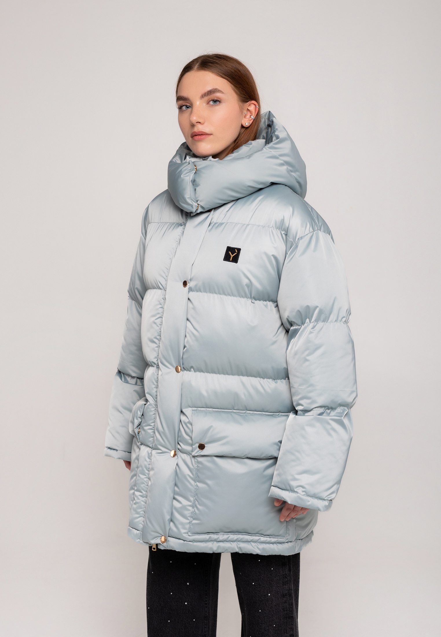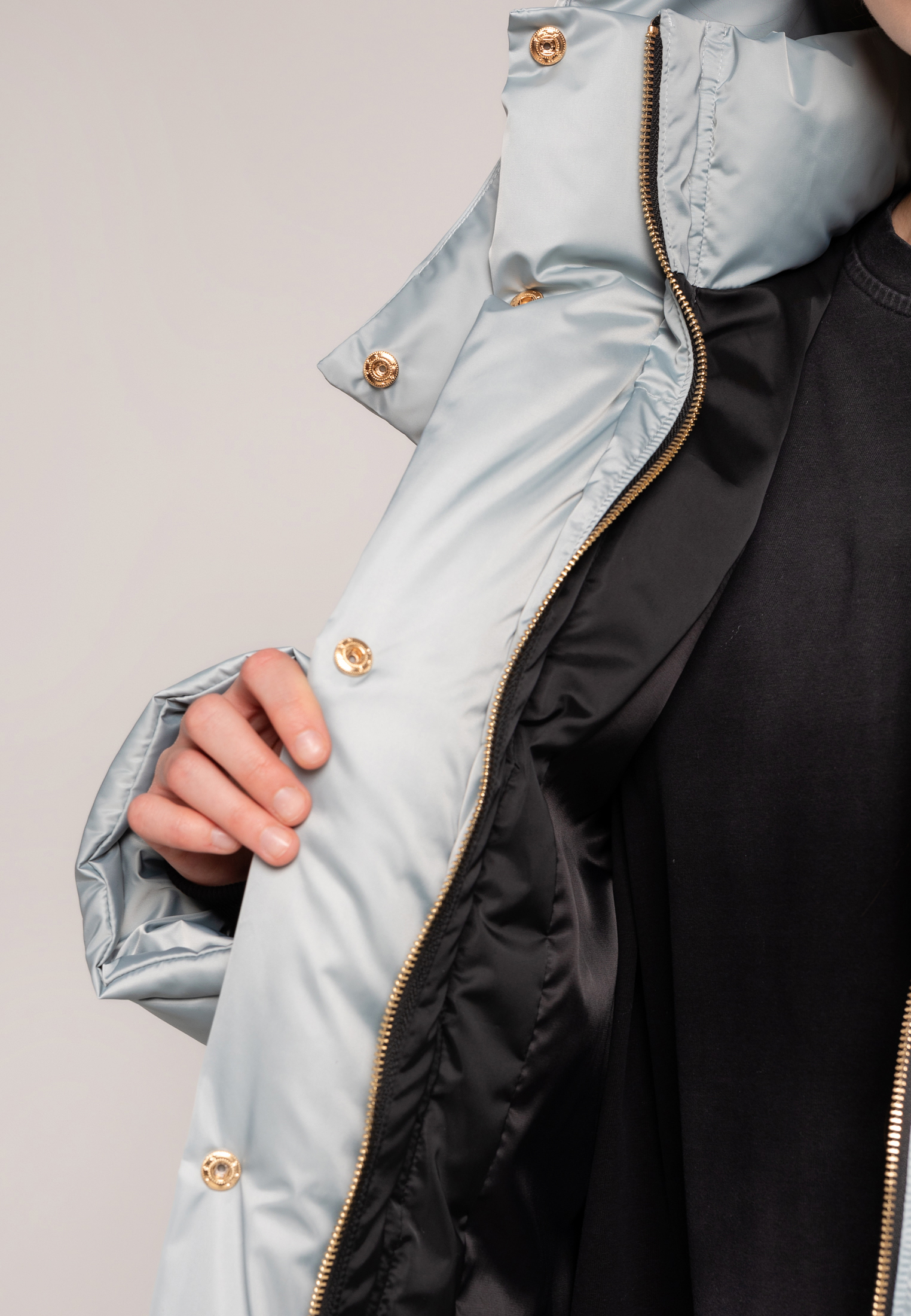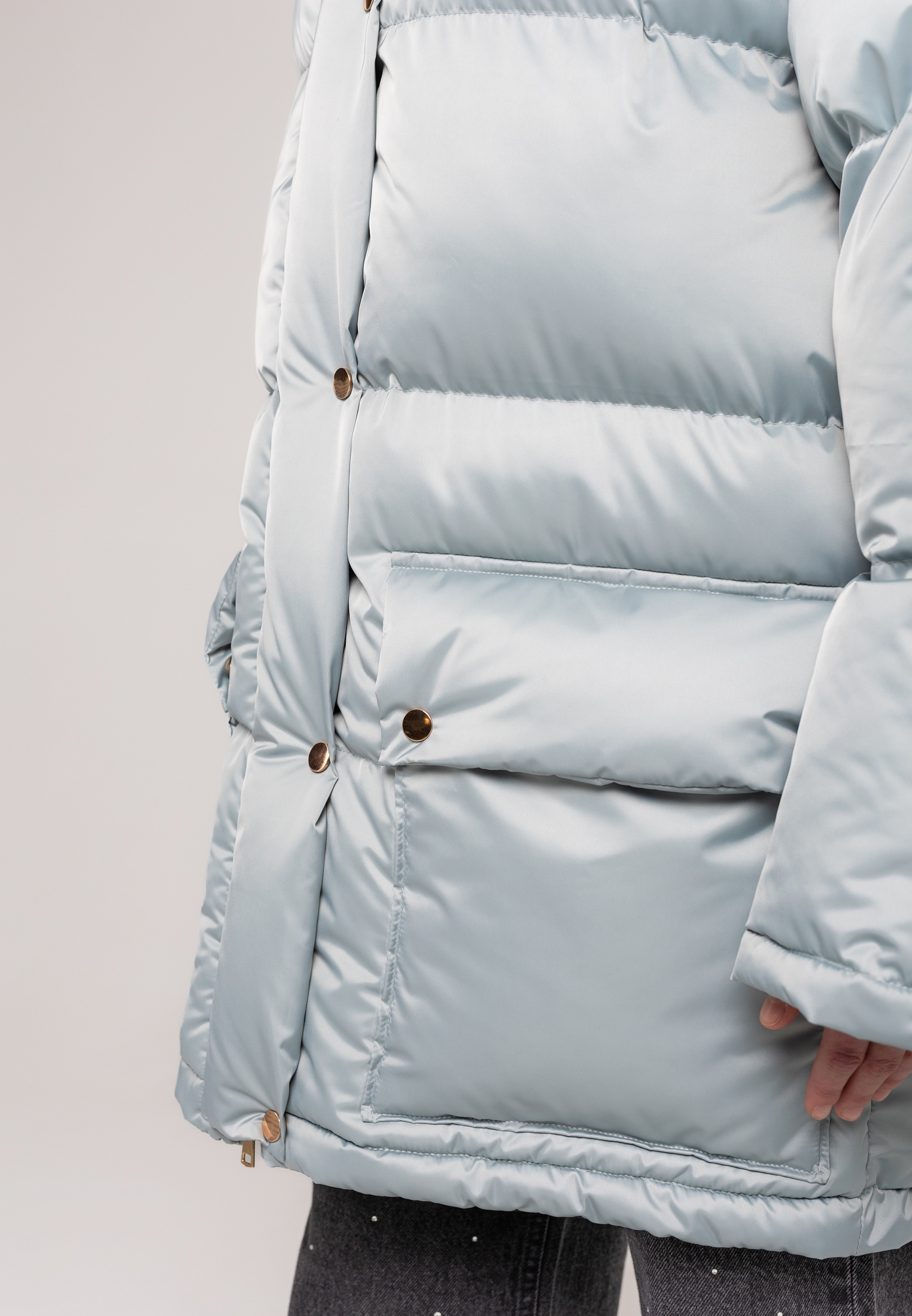 Пуховик объёмного кроя, выполнен из стёганого текстиля. Воротник стойка. Отстёгивающийся капюшон на кнопках. Застёжка на молнию и планку с кнопками. Карманы с клапаном.