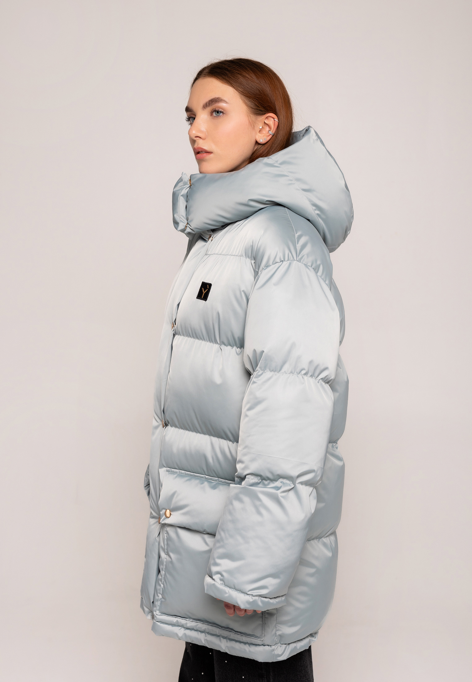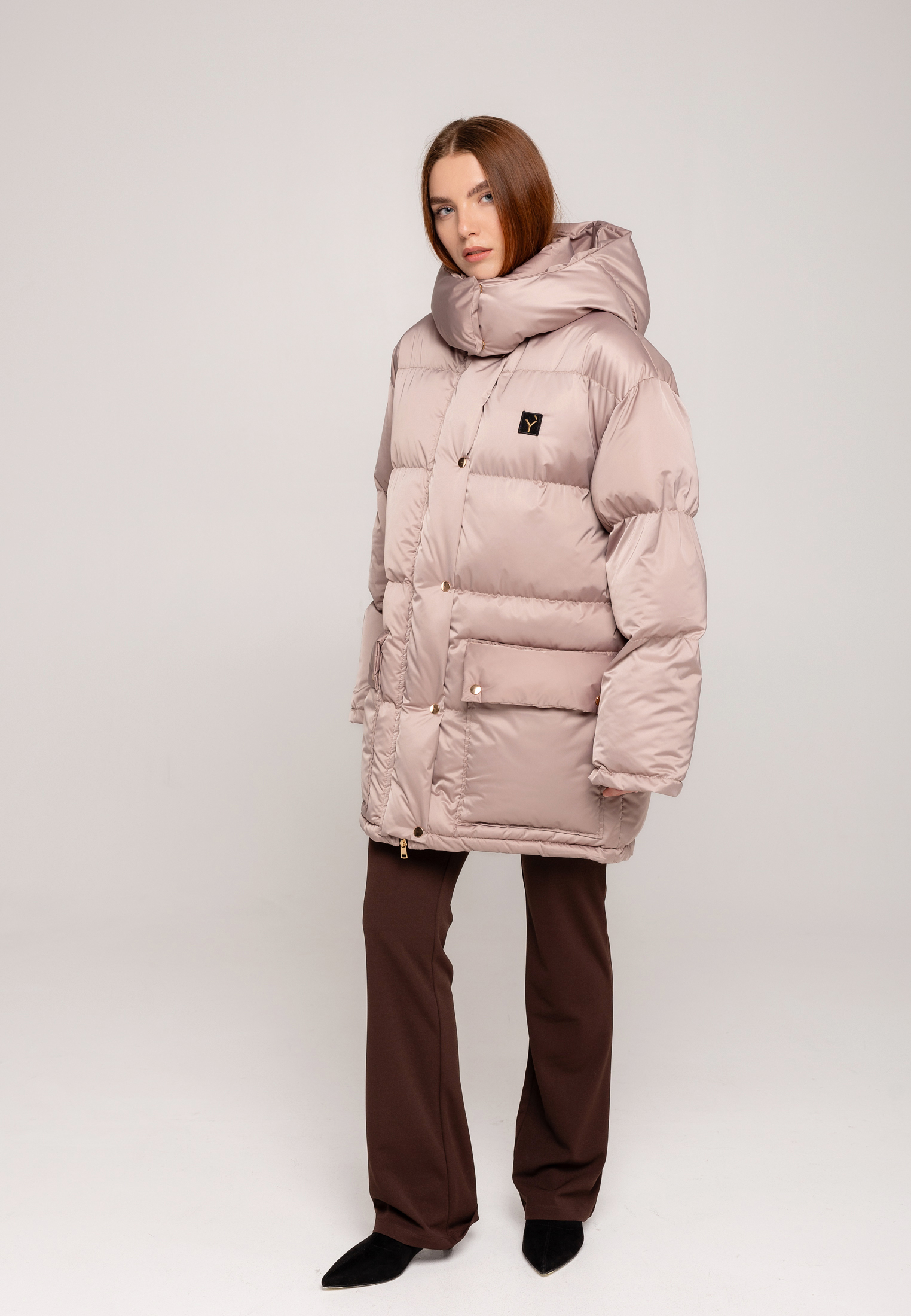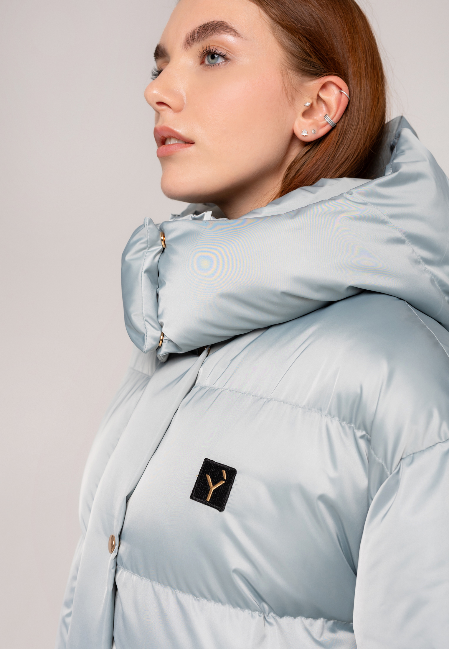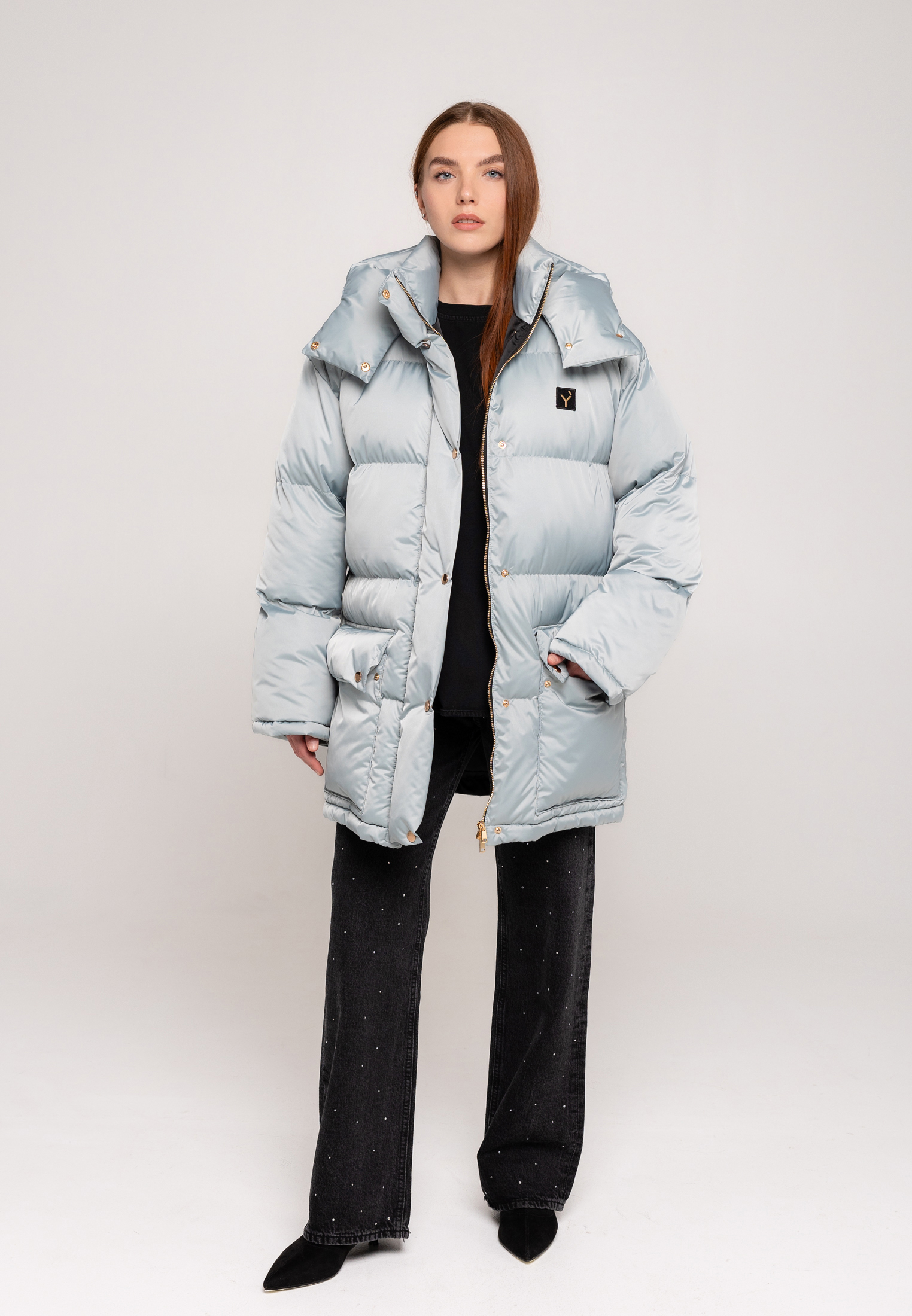 Пуховик объёмного кроя, выполнен из стёганого текстиля. Воротник стойка. Отстёгивающийся капюшон на кнопках. Застёжка на молнию и планку с кнопками. Карманы с клапаном.