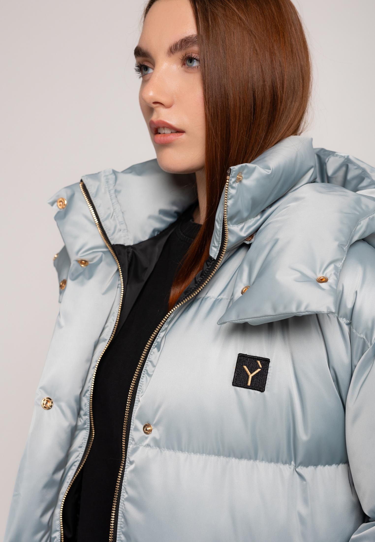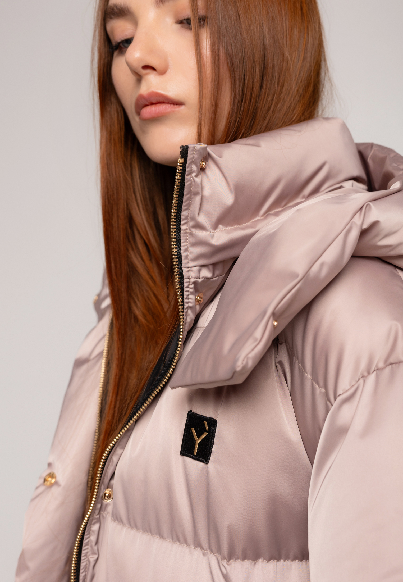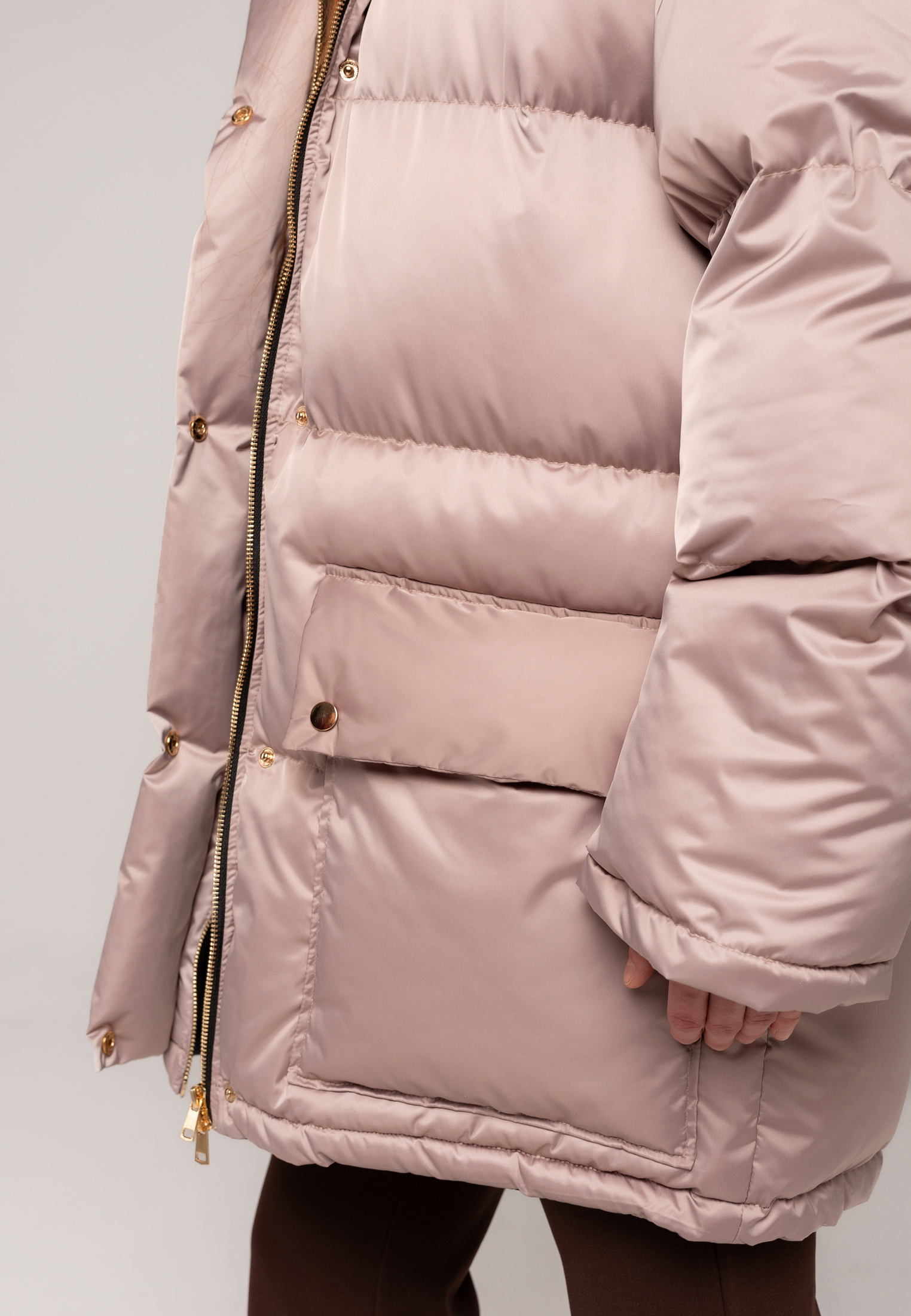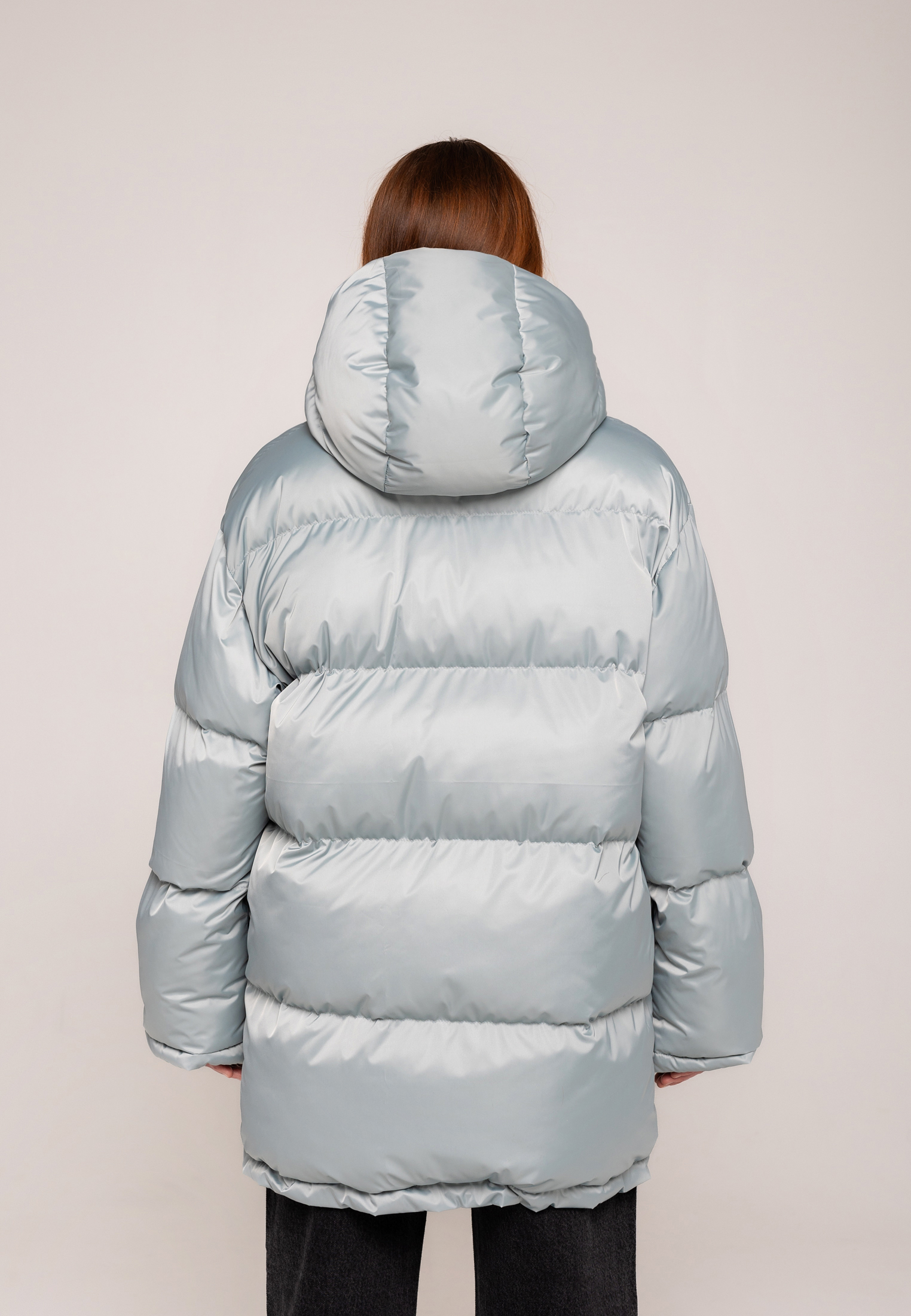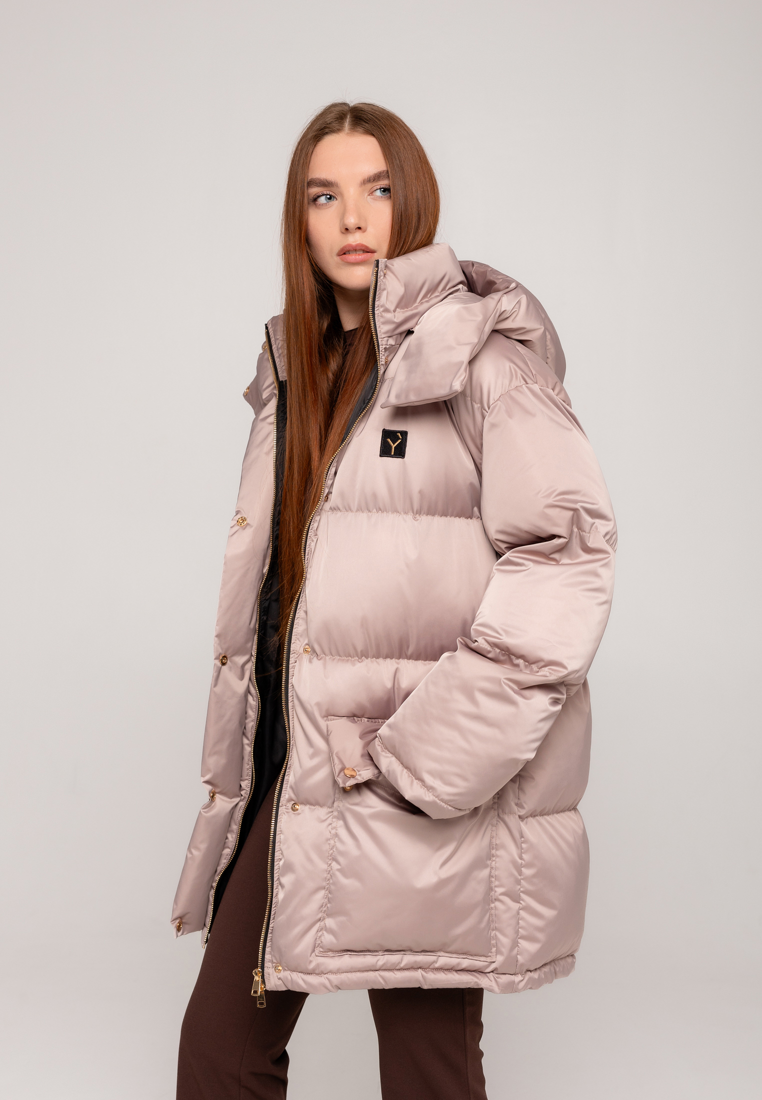 Пуховик объёмного кроя, выполнен из стёганого текстиля. Воротник стойка. Отстёгивающийся капюшон на кнопках. Застёжка на молнию и планку с кнопками. Карманы с клапаном.