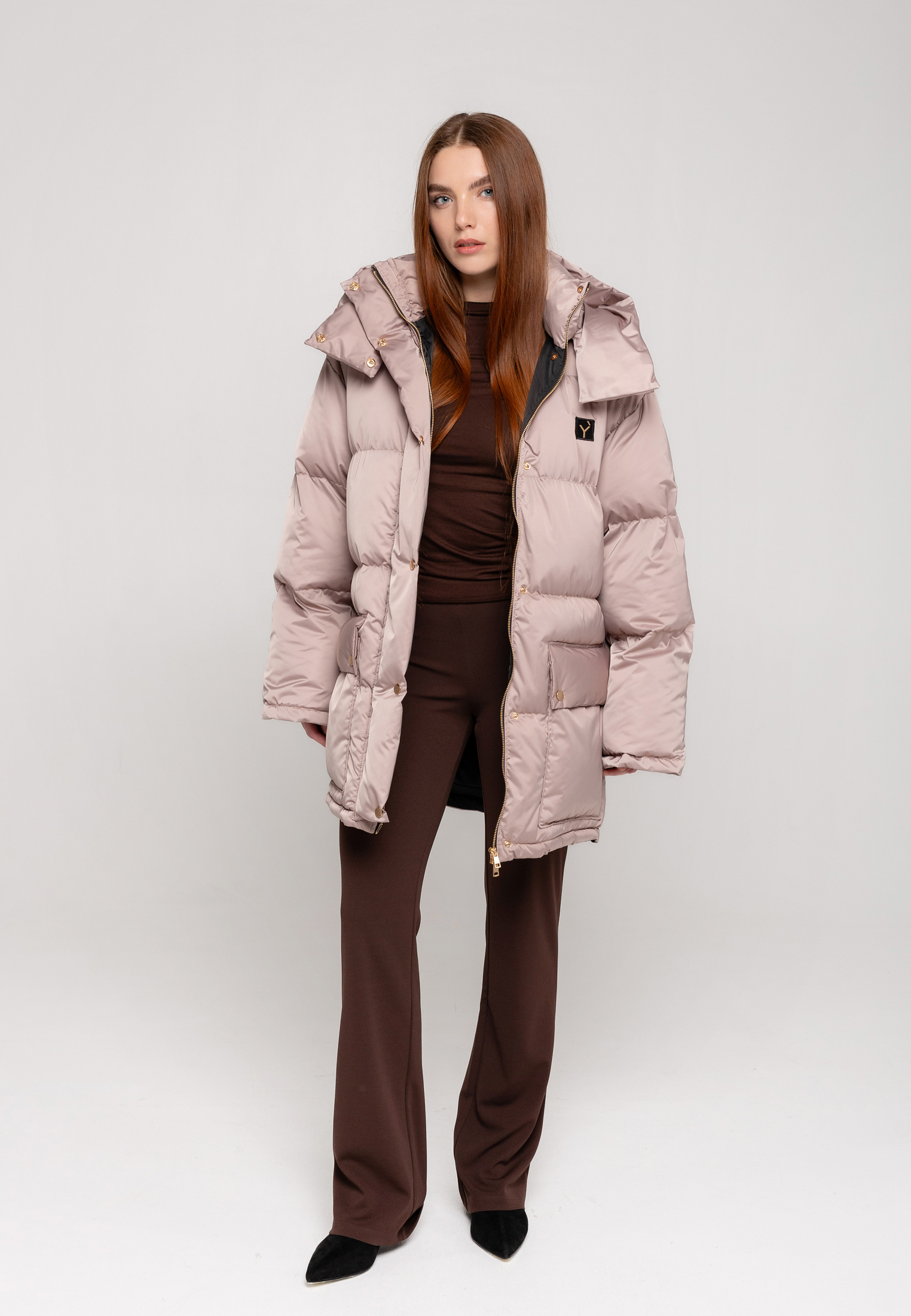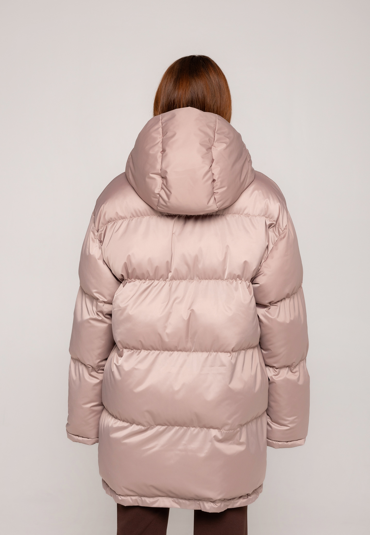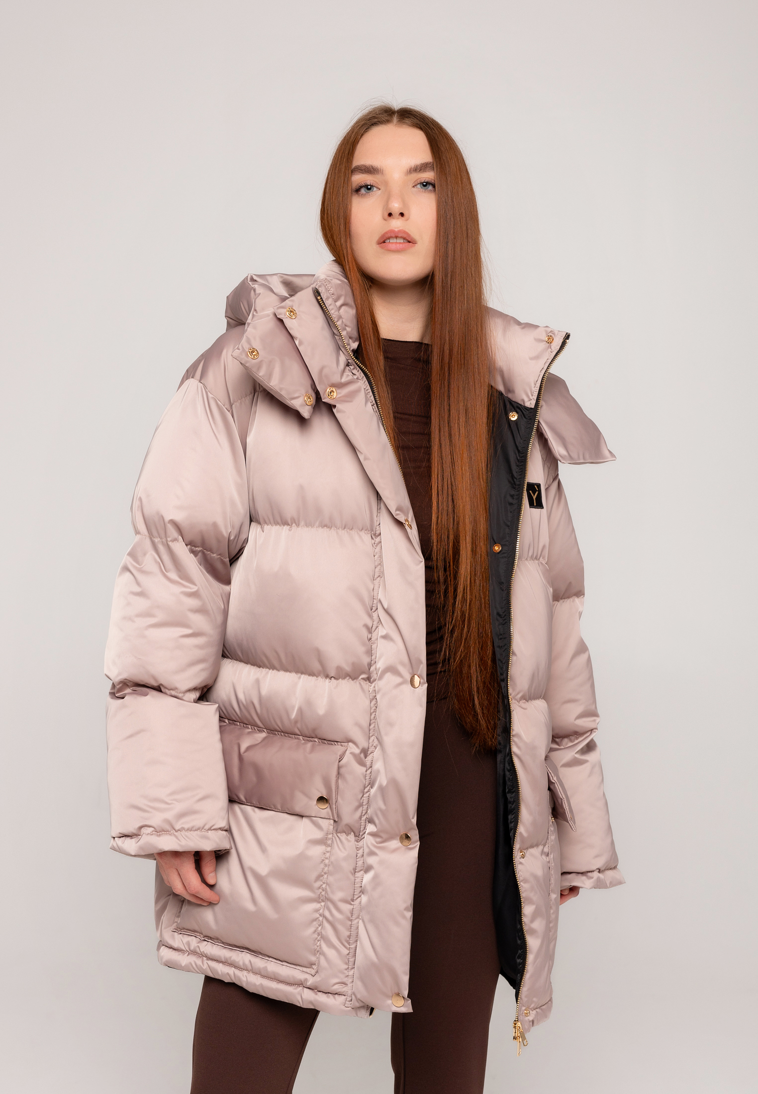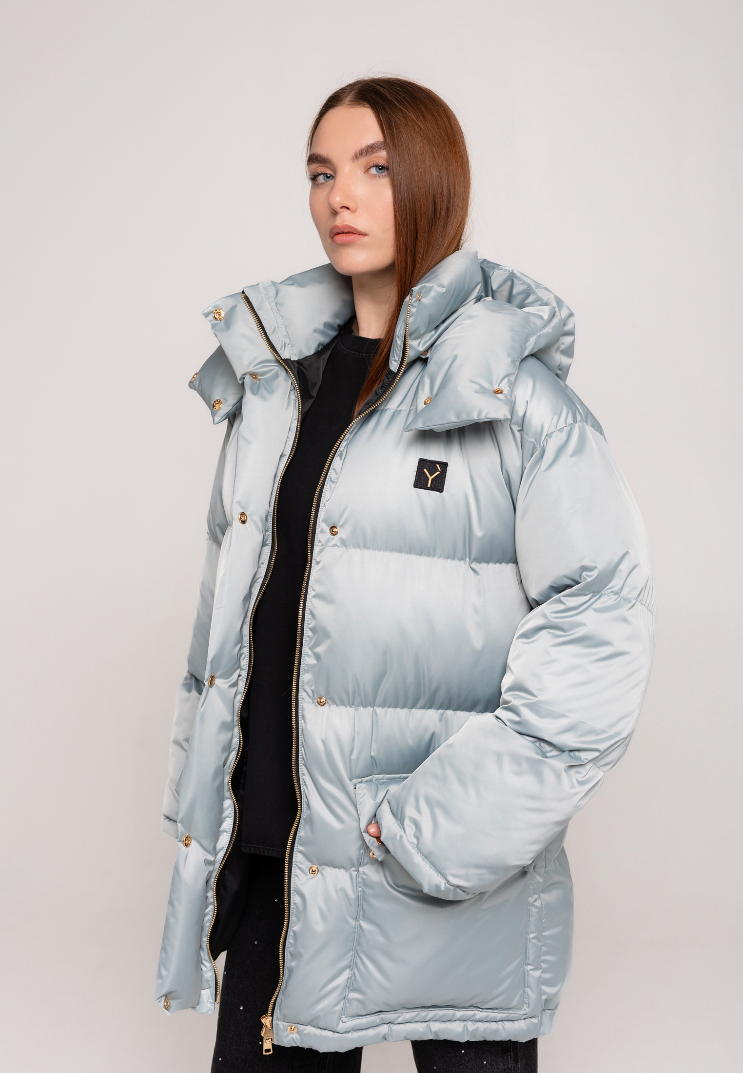 Пуховик объёмного кроя, выполнен из стёганого текстиля. Воротник стойка. Отстёгивающийся капюшон на кнопках. Застёжка на молнию и планку с кнопками. Карманы с клапаном.